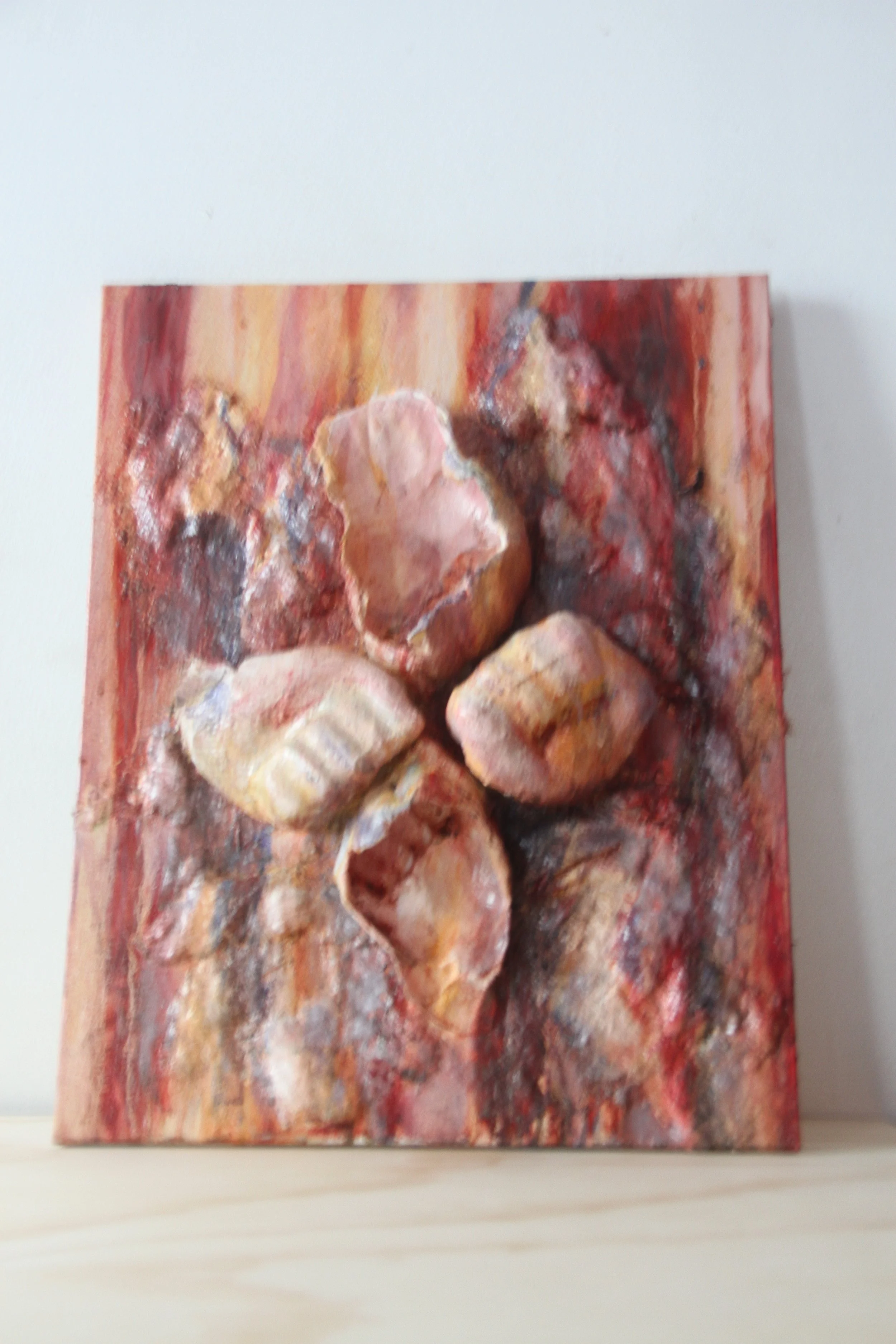 This sculptural painting honors Gaza's residents. Throughout the ongoing crisis, I've molded hearts and fists alongside diverse groups. I shaped left fists, for its proximity to the heart's main arterial network. The fist's form echoes a heart's shape. Fists also embody resistance and liberation.